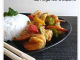 Ingrédients: 750 grammes de crevettes roses (bouquets) 1 poivron rouge 1 courgette 1 carotte 1 oignon 1 cuillère à soupe d'huile neutre 200 ml de sauce aigre...