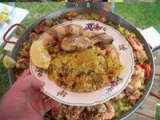 2kg de riz (ou un peu moins si il y a beaucoup d'enfants) 20 pilons de poulet, 15 tranches de poitrine de porc fraîche (si vous n'aimez pas le porc n'en mettez pas) 5 morceaux de râble de lapin, (ou plus si tout le monde aime) 800g de gambas crues (fraîch