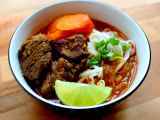 Ingrédients: 500 g de boeuf à ragout (voire 600g ; (viande pour bourguignon, gite) 1 litre de bouillon légume 2 gousses d'ail (ou 3) 1 bâton de cannelle 1,5...