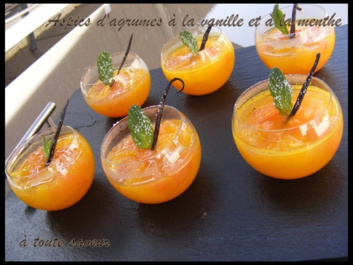 Aspics d'agrumes à la vanille et à la menthe. votez maintenant Dessertfacile15 min114 Kcal Envoyer cette recette à un ami Imprimer cette page Poser une question à l'auteur Publier votre photo de cette recette Ingrédients 6 1 pamplemousse 2 oranges 60 g de sucre en poudre 1 gousse de vanille 30 cl de jus d'orange frais 2 feuilles de gélatine 10 feuilles de menthe