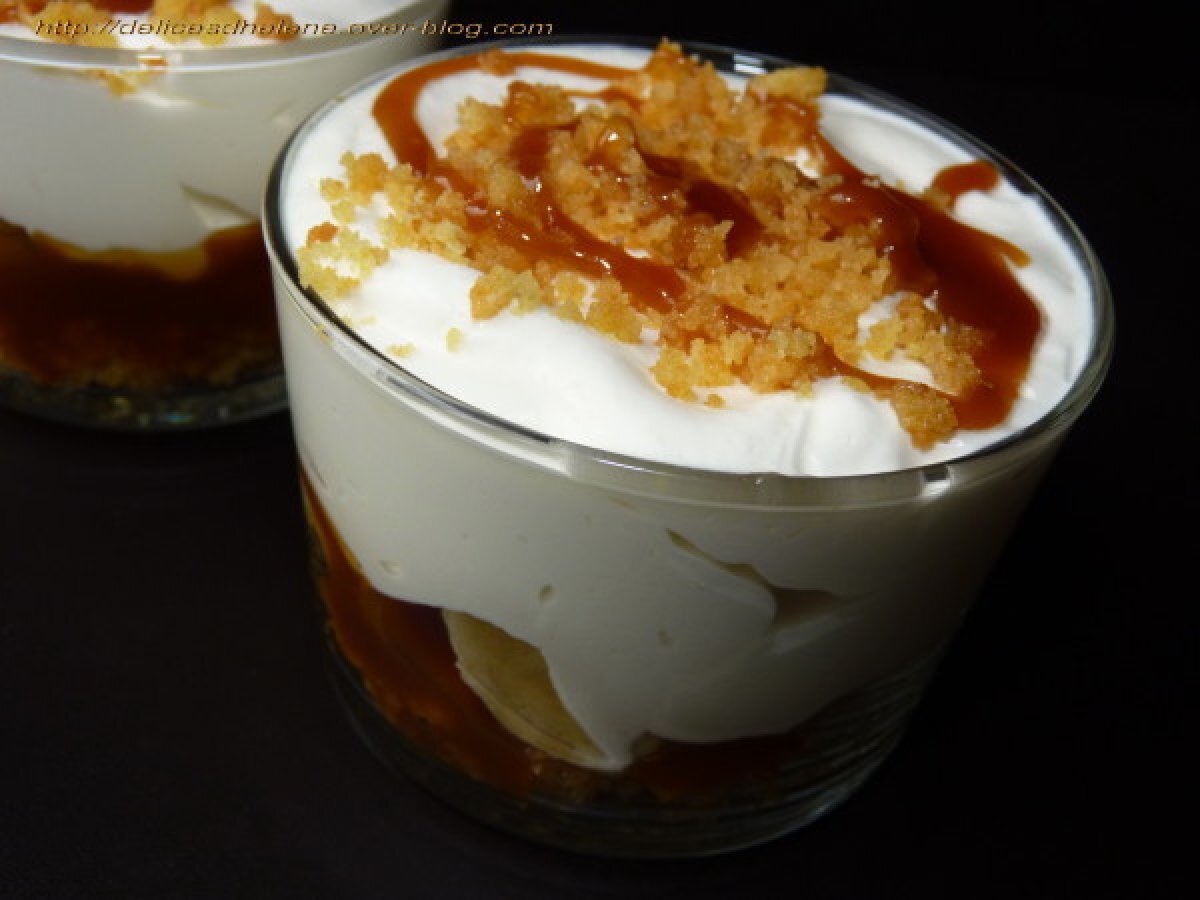 - Préparer le trifle dans un saladier ou dans des coupes individuelles en alternant les couches de biscuit, de banane en rondelles, de sauce caramel et de crème fouettée.