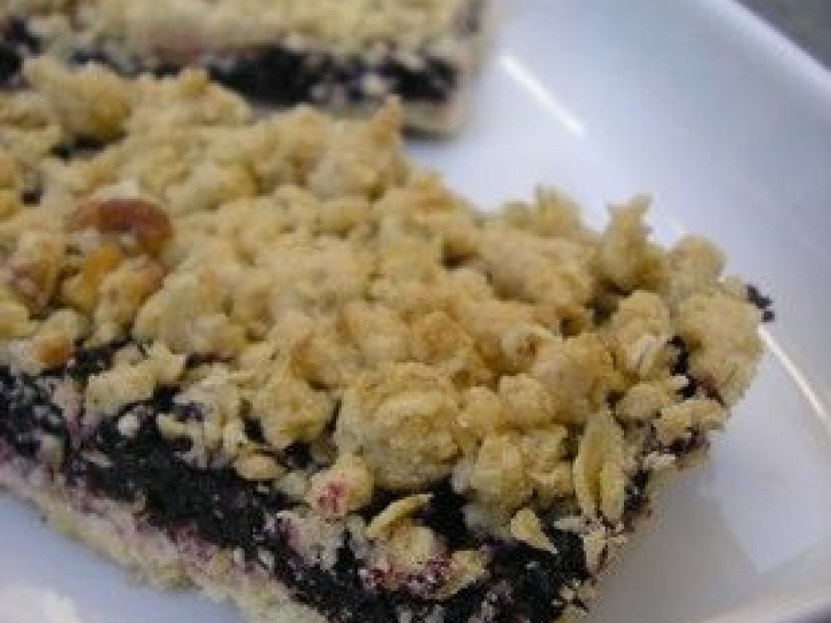Des barres croustillantes aux flocons d'avoine et aux myrtilles. La croûte à base de noix et les myrtilles presque confites sont irrésistibles...