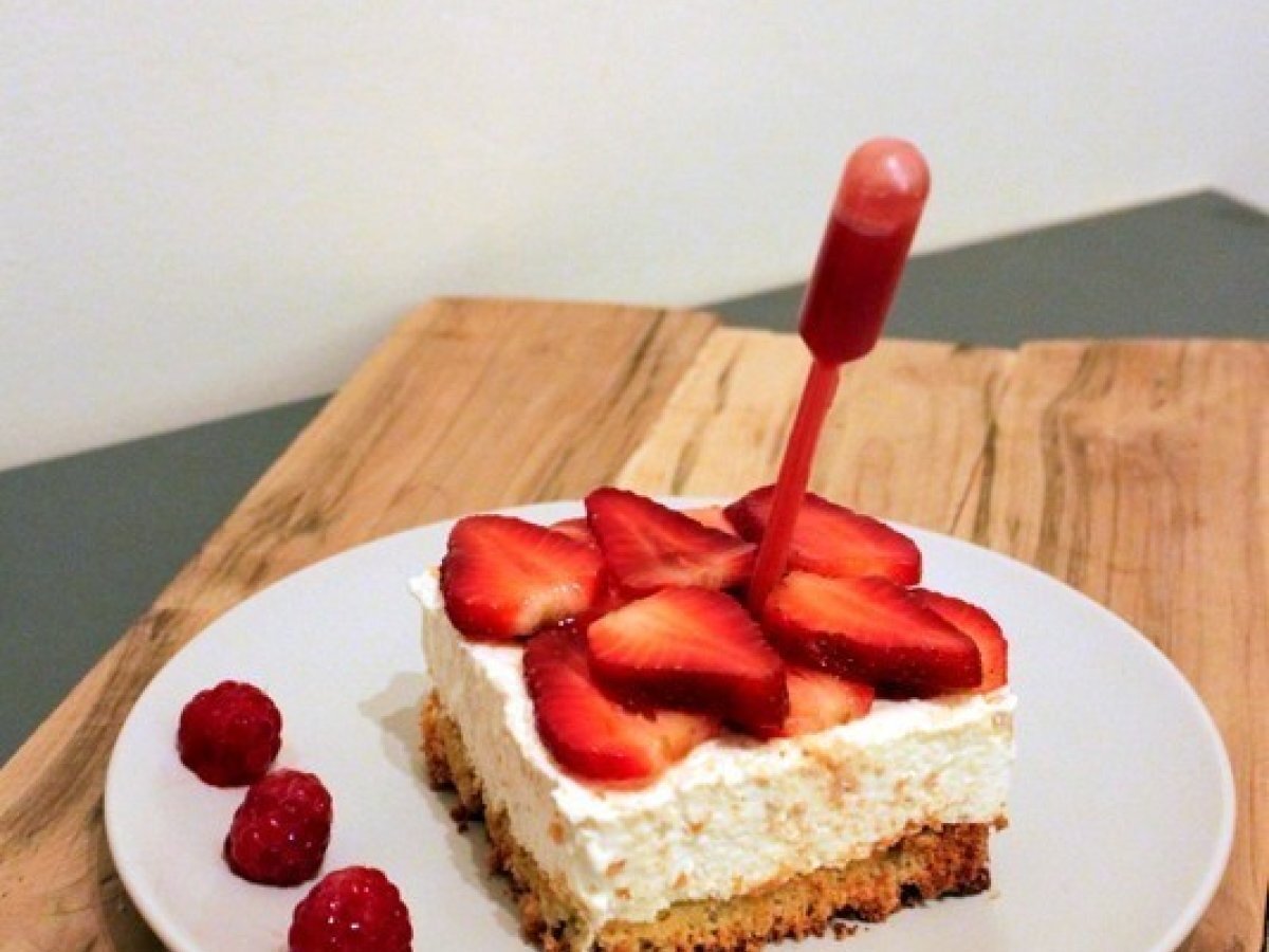 Voici un dessert de mousse au chocolat blanc sur une dacquoise à la pistache et accompagné de fraises et framboises. L’association de ses goûts est parfaite, on a le fondant du chocolat blanc, le moelleux de la dacquoise, le croquant des pistaches et l’acidulé des fraises et framboises. Ce dessert a beaucoup plu !