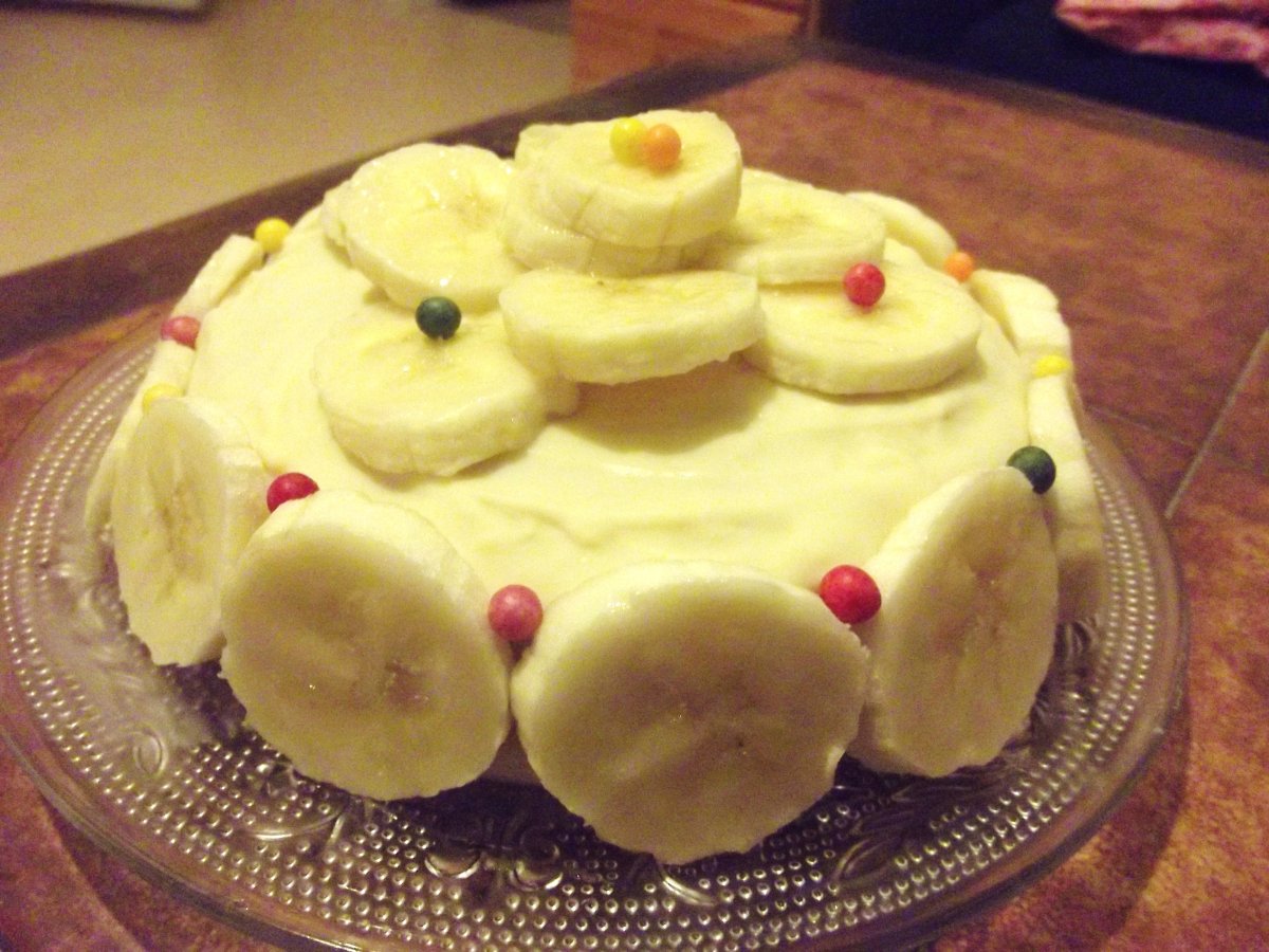 Un gâteau tout léger garni de purée de banane pour le moelleux et recouvert d'un glaçage au chocolat blanc pour le croquant.