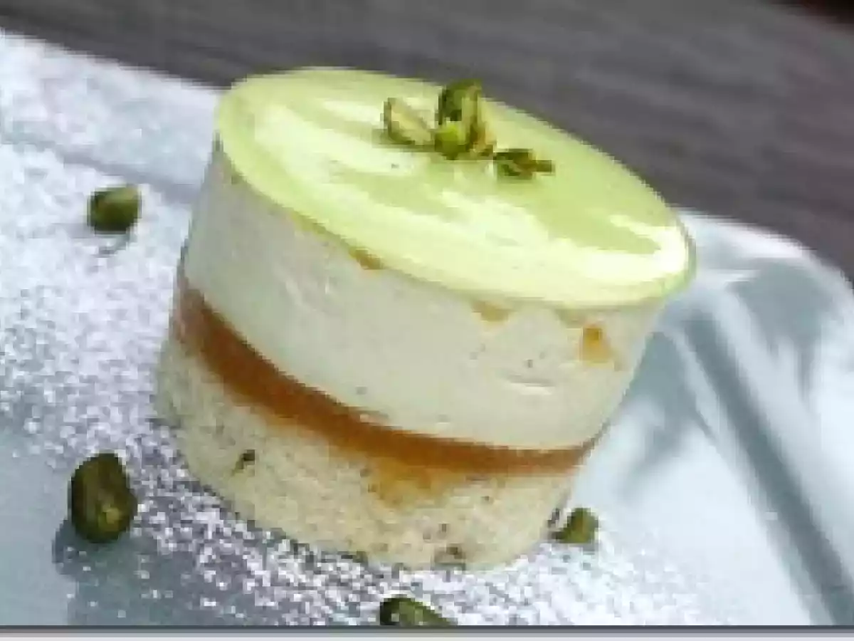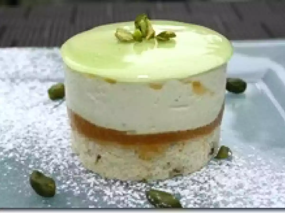 Biscuit financier, gelée d'abricot et mousse à la pistache PrécédentSuivant Dessertmoyen2 h 10 m Envoyer cette recette à un ami Imprimer cette page Poser une question à l'auteur Publier votre photo de cette recette Ingrédients 4 Pour le biscuit financier (moule de 24 cm de diamètre) : 100 g de beurre 50 g de farine 100 g de sucre glace 50 g de poudre d'amandes 3 blancs d'oeufs 2 cuillères à soupe de pistache verte émondée Pour la mousse à la pistache : 1,5 feuilles de gélatine Un ¼ litre de crème anglaise 20 g de pâte de pistache 12 cl de crème liquide entière Pour la compote d'abricot : 1 feuille de gélatine 4 cuillères à soupe de confiture d'abricot Finition : 1 sachet de nappage à tarte 2 cuillères à soupe de sucre en poudre Quelques gouttes de colorant vert éclats de pistache émondées