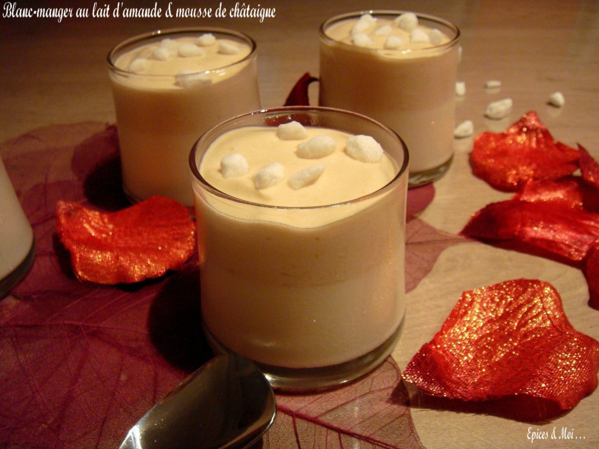 Blanc-manger au lait d'amande & à la mousse de châtaigne PrécédentSuivant Dessertfacile20 min404 Kcal Envoyer cette recette à un ami Imprimer cette page Poser une question à l'auteur Publier votre photo de cette recette Ingrédients 4 30 cl de lait d'amande 30 cl de crème liquide 3 feuilles de gélatine 30 g de sucre en poudre 125 g de crème de marron 1 blanc d'oeuf 1 càs de sucre en grains Coût estimé: 2.73Euros€ (0.68€/part)