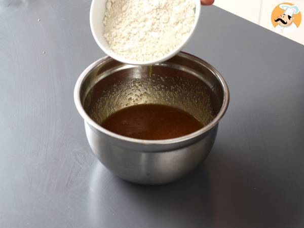 Ajouter le beurre fondu et l'extrait de vanille et mélanger. Incorporer ensuite la farine et le sel.