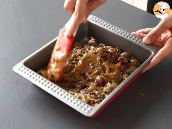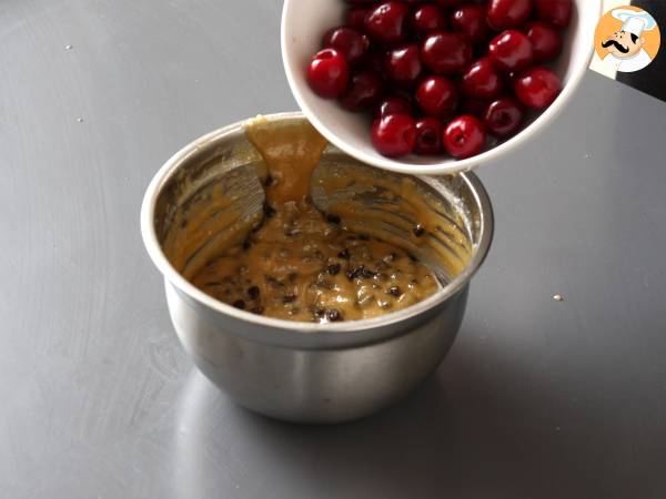 Et enfin, incorporer les pépites de chocolat et les cerises lavées et dénoyautées (ou coupées en deux).