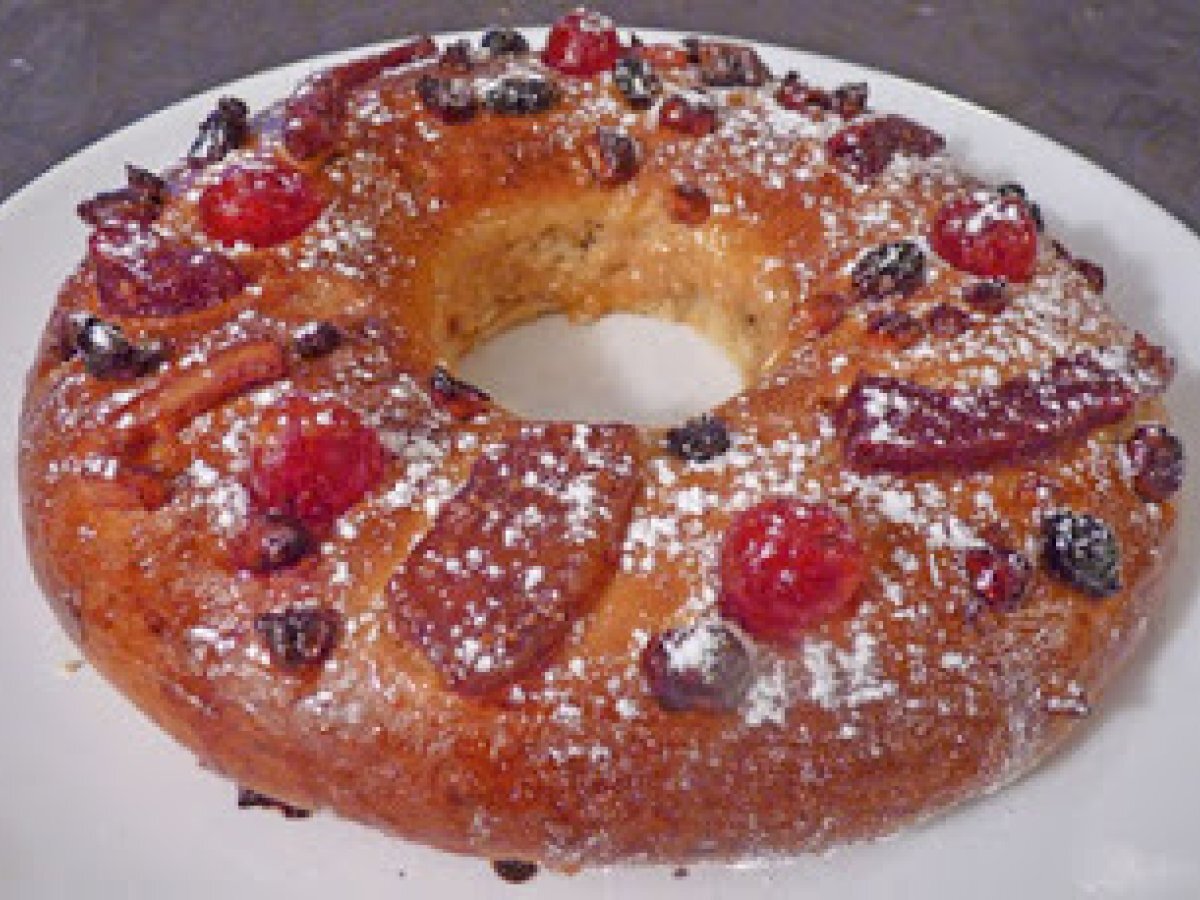 Avant d'enfourner, badigeonner la ou les couronnes avec le jaune d'oeuf battu avec un peu de lait et disposer dessus les fruits confits.
