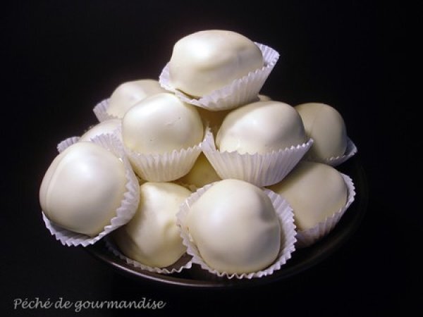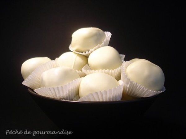 Bouchées de chocolat blanc, ganache au chocolat au lait et aux fruit de la passion