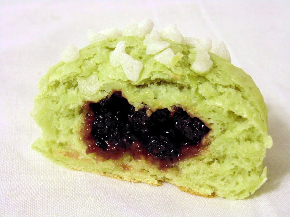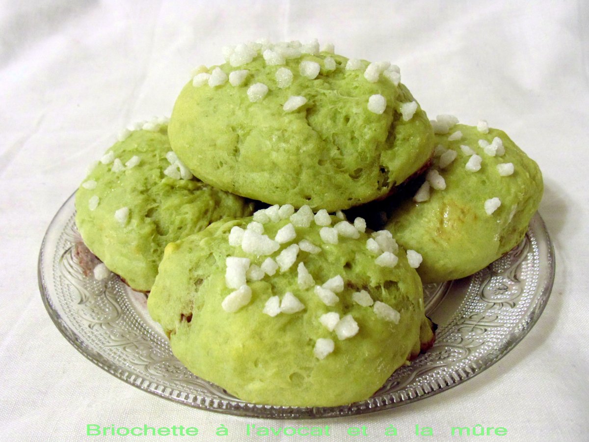 Ce sont de belles briochettes originales. Elles sont vertes naturellement grâce à l'avocat qui les rend moelleuses. Leur coeur cache un coeur fruité à la mûre.