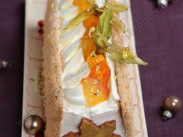 Bûche au grand marnier PrécédentSuivant Dessertmoyen2 h 30 m Envoyer cette recette à un ami Imprimer cette page Poser une question à l'auteur Publier votre photo de cette recette Ingrédients 8 Dacquoise 60 g blanc d’oeufs 30 g sucre 50 g de poudre d'amande 50 g sucre glace Biscuit aux oranges confites : 10 g de beurre 75 g de sucre glace 50 g de poudre d'amande 40 g de farine 2 oeufs 50 g d'écorce d'orange confite Mousse mascarpone au grand Marnier : 250 g de mascarpone 3 oeufs 80 g de sucre 6 biscuits cuillère 100 ml de jus d'orange 4 cuillères à soupe de grand Marnier 150 ml de chantilly 1 sachet de sucre vanillé 2 feuilles de gélatine Clémentines, oranges confites et physalis Feuilles d'or