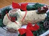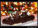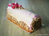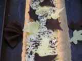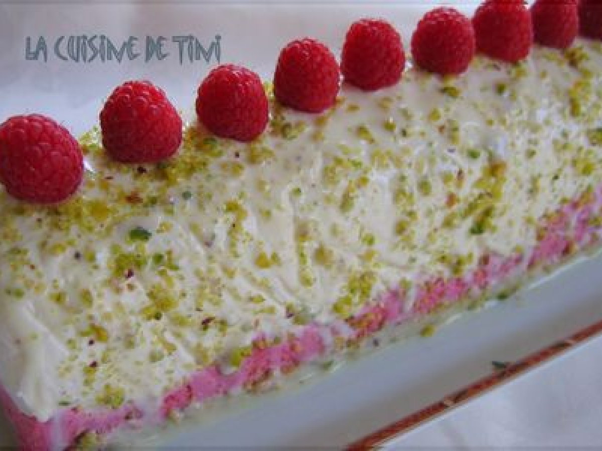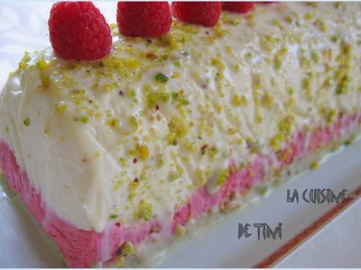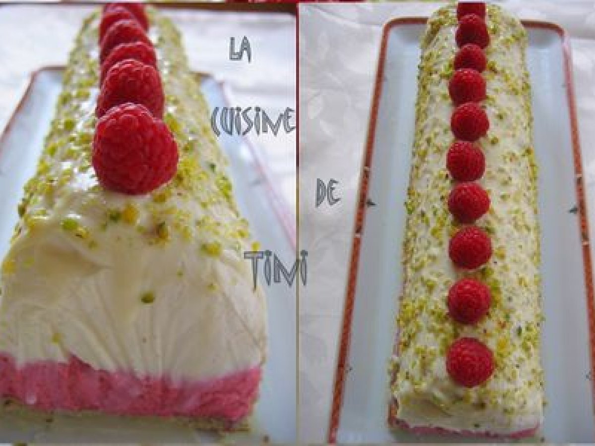Bûche de noël: dacquoise pistache/mousse chocolat blanc et mousse framboises
