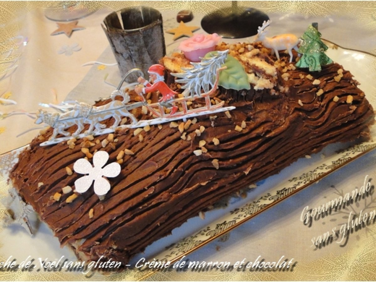 Bûche de noël sans gluten, à la crème de marron au chocolat Dessertfacile32 min398 Kcal Envoyer cette recette à un ami Imprimer cette page Poser une question à l'auteur Publier votre photo de cette recette Ingrédients 10 Pour la pâte à biscuit : 3 oeufs 150 g de farine sans gluten 5 cuillères à soupe d'eau chaude 125 g de sucre 1 sachet de levure chimique sans gluten Pour fourrer : 400 g de crème de marrons 125 g de chocolat amer 100 g de beurre Pour parfumer : 1/2 verre d'alcool de votre choix, rhum, cognac mélangé à 1/2 verre d'eau Pour décorer : des pépites de noisettes caramélisées Vahiné des petits sujets de Noël en plastique