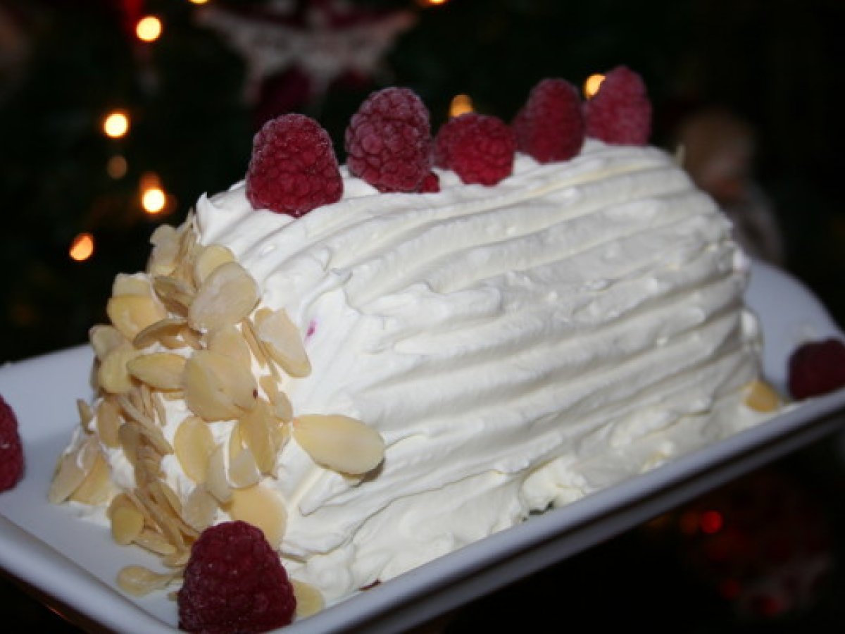 Bûche glacée chocolat, framboises, chantilly, coeur de meringue