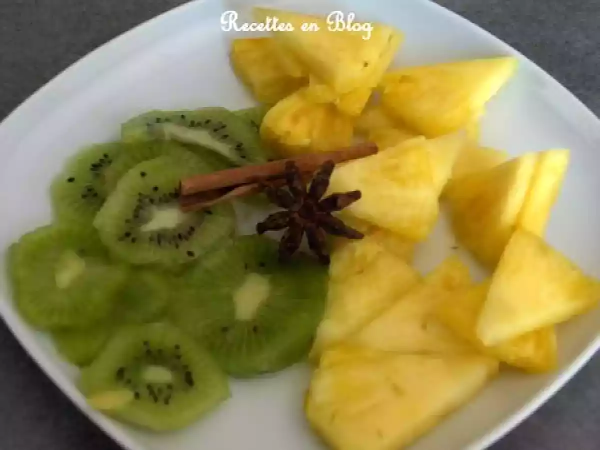Carpaccio d'ananas et kiwis au citron vert votez maintenant Dessertfacile20 min Envoyer cette recette à un ami Imprimer cette page Poser une question à l'auteur Publier votre photo de cette recette Ingrédients 4 2 citrons verts 2 cuillères à café d'édulcorant ou 4 de sucre 2 cuillères à café de rhum 1 ananas 4 kiwis 10 cl d'eau quelques feuilles de menthe facultatives