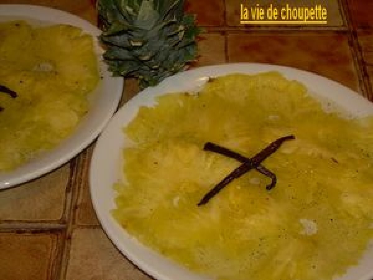Carpaccio d'ananas frais Dessertfacile25 min457 Kcal Envoyer cette recette à un ami Imprimer cette page Poser une question à l'auteur Publier votre photo de cette recette Ingrédients 2 1/2 ananas frais 90 g de sucre 5 cl d'eau 2 cuillères à soupe de rhum blanc gingembre frais râpé en poudre 2 cuillères à soupe de vanille liquide 1/2 gousse de vanille Coût estimé: 2.81Euros€ (1.41€/part)