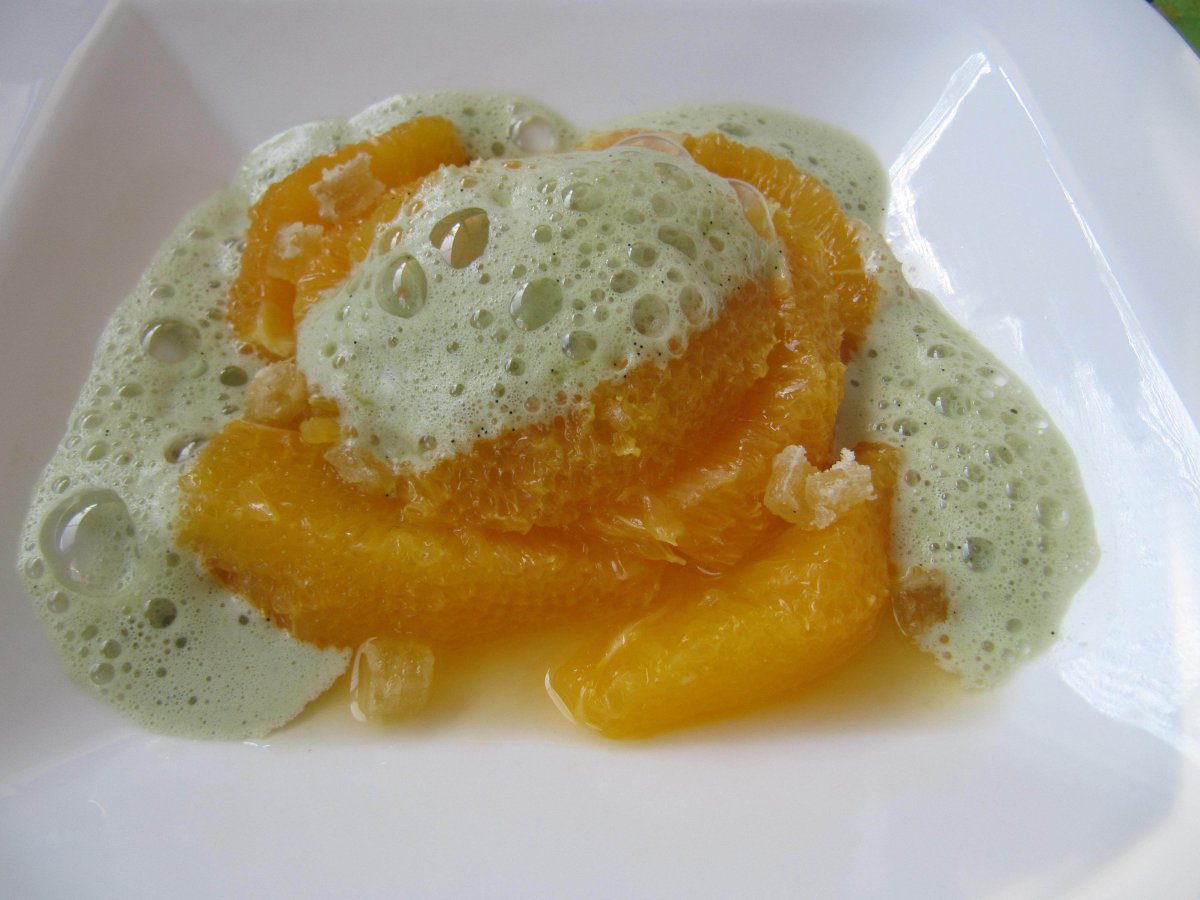 Carpaccio orange, gingembre, émulsion vanille matcha