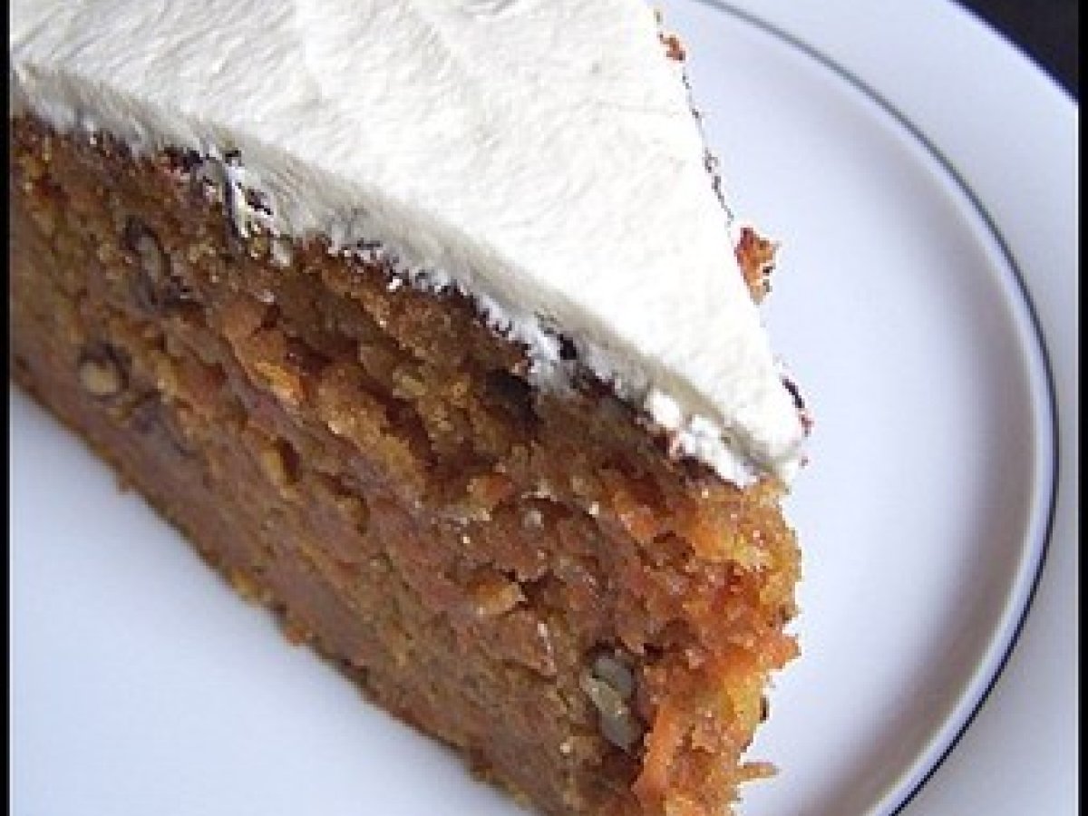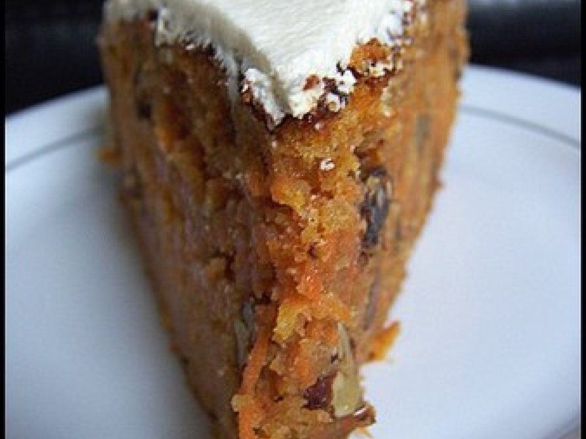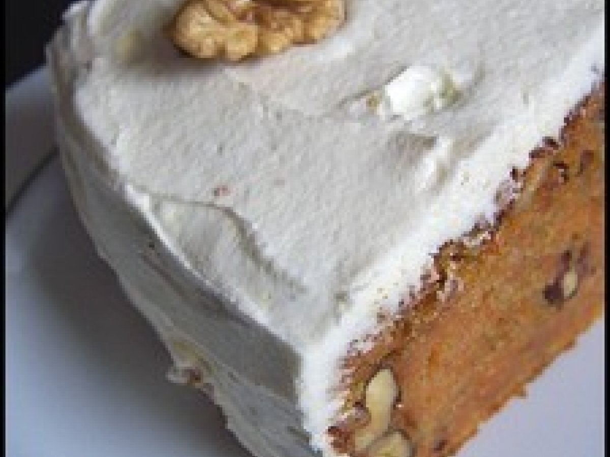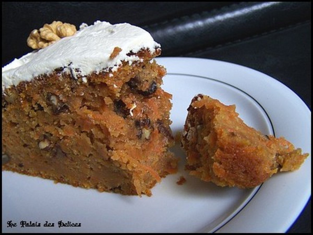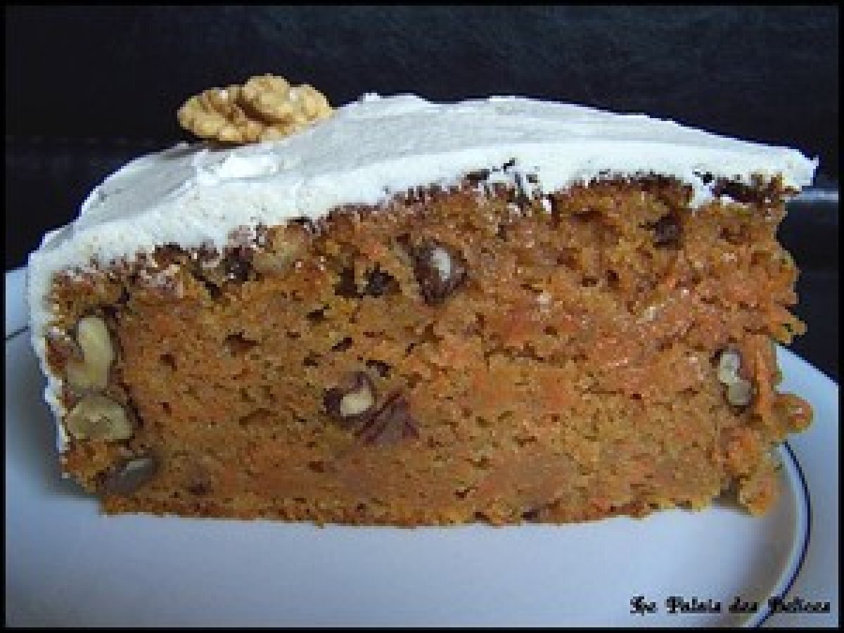 Un carrot cake ultra-moelleux, dense et bien humide, peu sucré, légèrement épicé et garnit de morceaux de dattes (ou raisins secs), d'éclats de noix croquantes et combinées avec son crémage au beurre, d'un blanc presque immaculé.