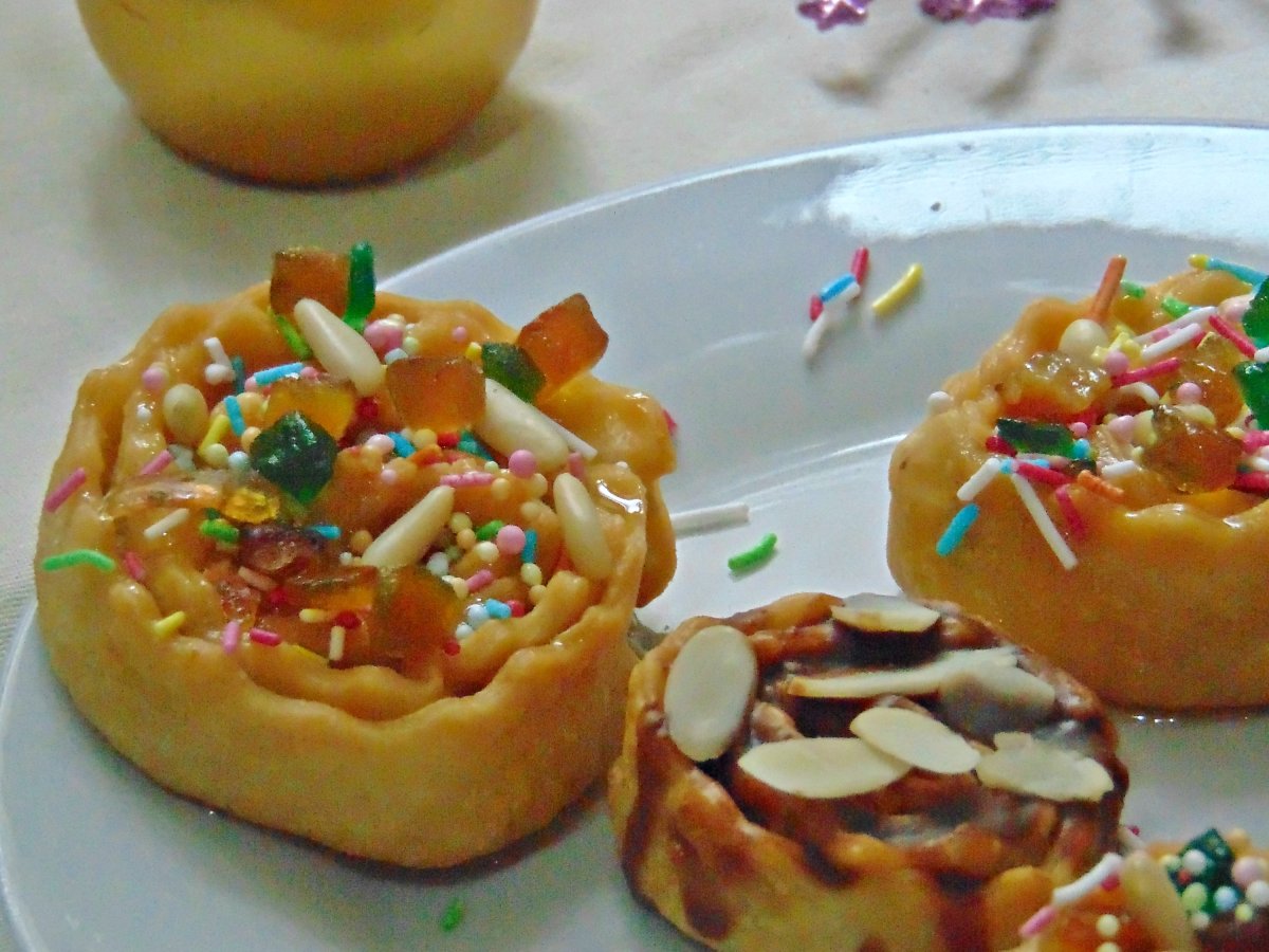 - Verser le miel réchauffé (ou le chocolat fondu), le vermicelle de couleur, les pignons de pin, les fruits confits. Si vous réalisez des cartellate avec le chocolat fondu, déposer des lamelles d'amande par exemple.