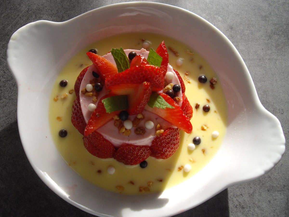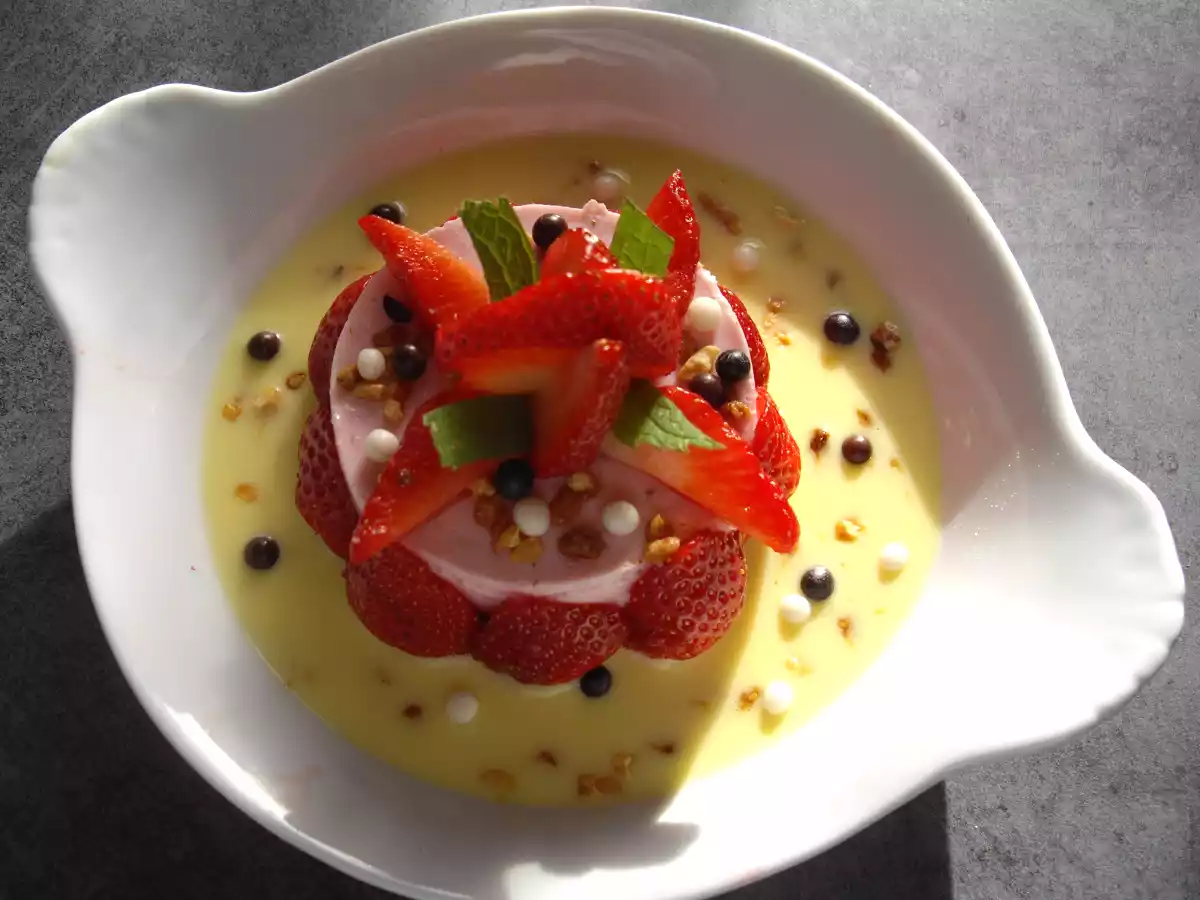 Charlotte aux fraises et biscuits roses Dessertmoyen1 heure Envoyer cette recette à un ami Imprimer cette page Poser une question à l'auteur Publier votre photo de cette recette Ingrédients 6 . 6 cercles de présentation . 12 biscuits roses . 50 g de beurre . 50 g de sucre cassonade . 40 g de sucre . 10 cl de crème liquide + 4 c. à soupe . 4 feuilles de gélatine . 200 g de fraises . 2 petits suisses. . 1 cuillère à café de marc de Champagne . 1 cuillère à soupe de lait . quelques feuilles de menthe . Crème anglaise . facultatif : noisettes concassées ou pépites caramélisées Vahiné