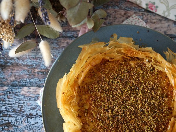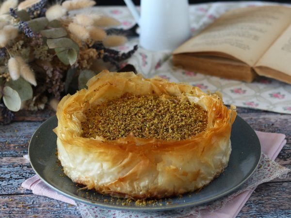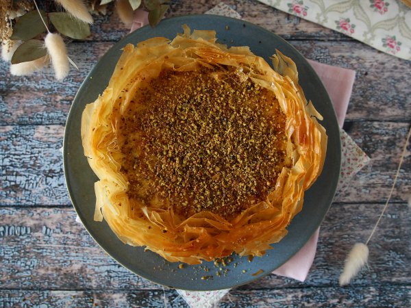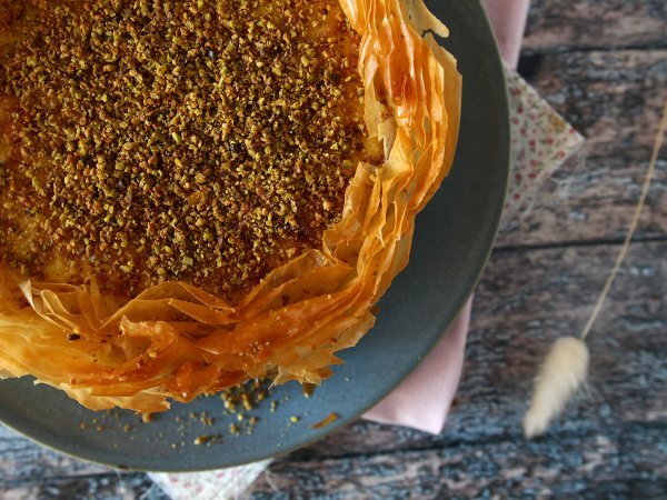 Vous pouvez tout simplement mettre uniquement la base pâte filo+beurre au four pendant 20 minutes à 180°C avant de poursuivre la recette et ajouter les pistaches.