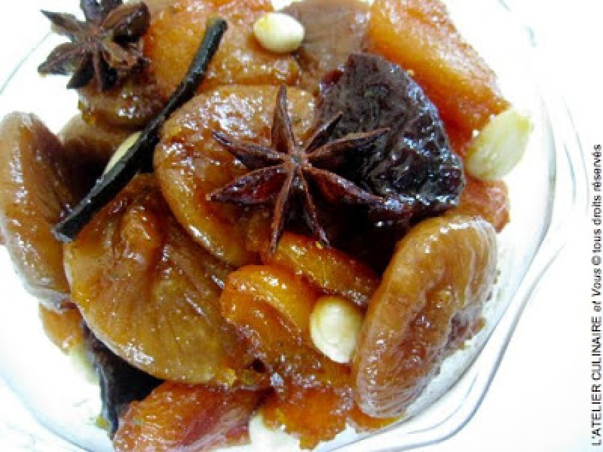 Compotée de fruits secs aux épices Dessertfacile35 min768 Kcal Envoyer cette recette à un ami Imprimer cette page Poser une question à l'auteur Publier votre photo de cette recette Ingrédients 2 10 abricots secs 10 figues sèches 7 pruneaux Quelques amandes entières 3 cuillères à soupe de miel 2 étoiles d'anis 1 petite cuillère à café de cannelle 1 clou de girofle 3 graines de cardamone verte