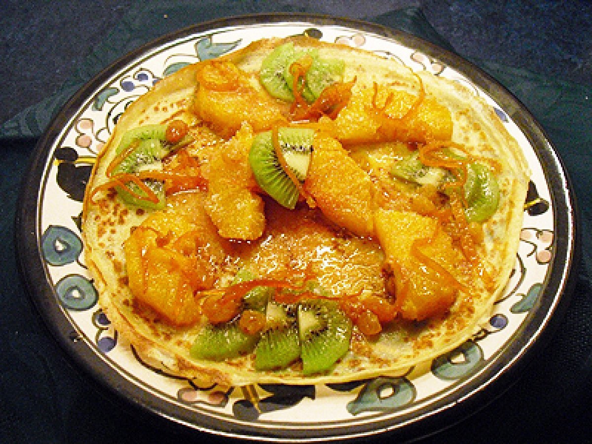 Crêpes a l'orange Dessertmoyen45 min Envoyer cette recette à un ami Imprimer cette page Poser une question à l'auteur Publier votre photo de cette recette Ingrédients 6 6 crêpes maison 3 kiwis 4 grosses oranges 5 cl de rhum 15 cl de jus d?orange 100 gr de cassonade 3 cuillères à soupe de raisins secs 2 sachets de sucre vanillé 1 cuillère à café de cannelle 2 cuillères à soupe de noix de coco râpée 50 gr de beurre 1 demi citron
