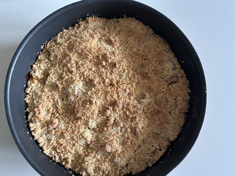 Faire cuire au four préchauffé à 180°C pendant 40 minutes. Ce temps peut varier d'un moule à l'autre. Le moule utilisé était assez épais. Le crumble doit être bien doré.