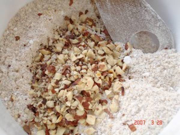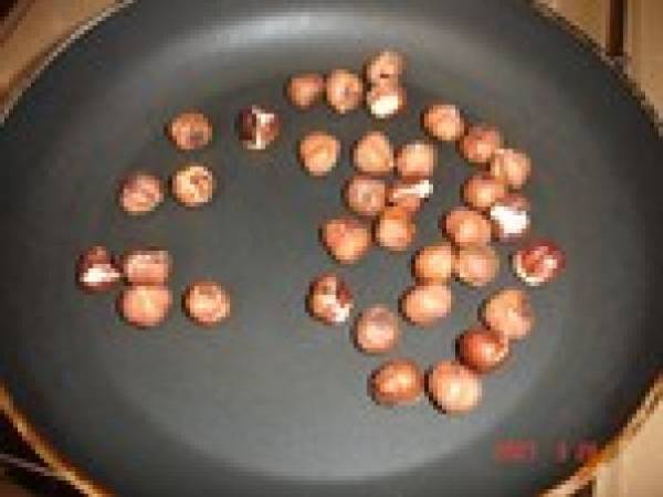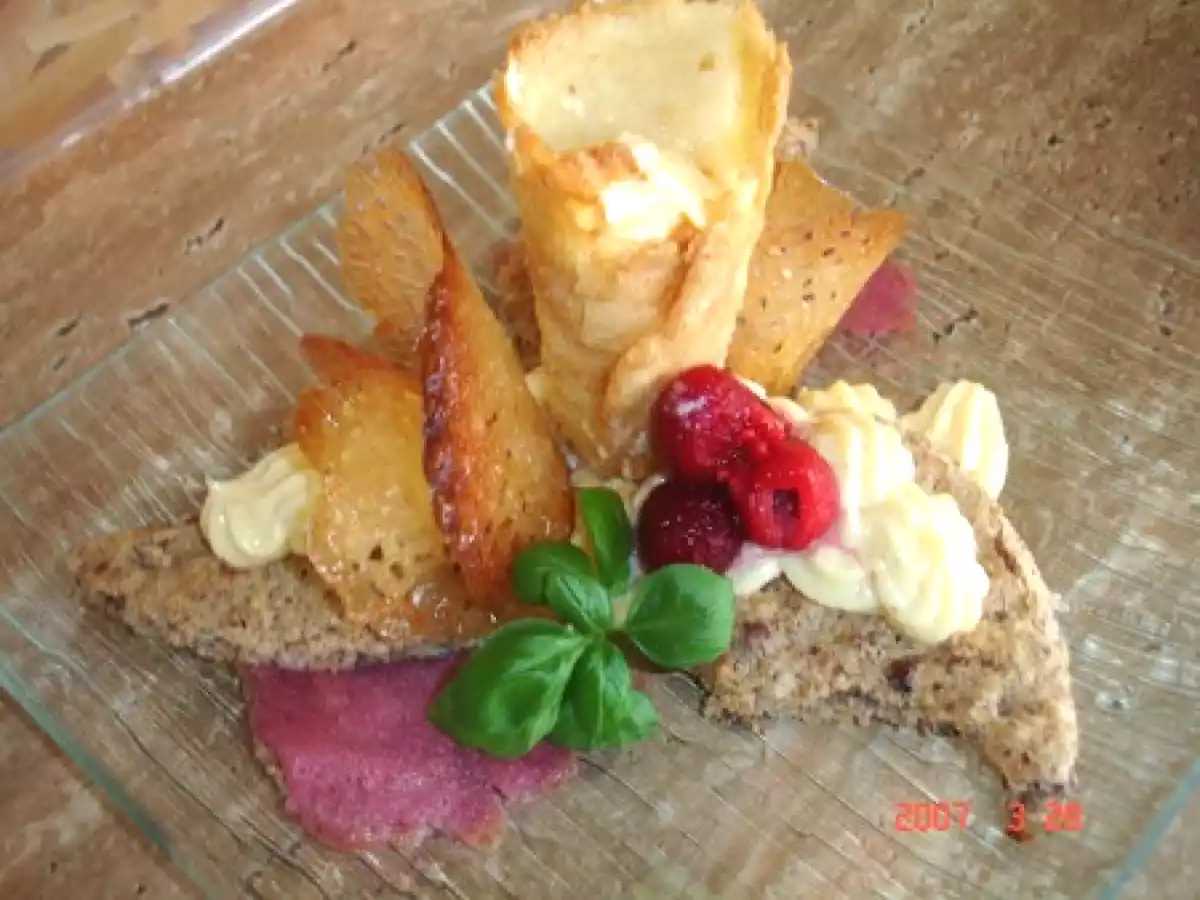 Dacquoise aux noisettes, tuiles bananes et crème pâtissière