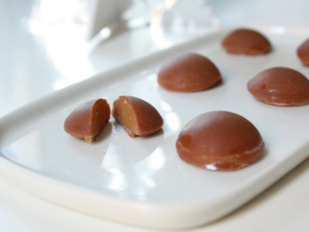 - Verser rapidement le caramel soit dans des petits moules à chocolat (en silicone) soit en fine couche dans un plat carré (en silicone). Si le caramel est moulé dans le plat carré, détailler des rectangles à l'aide d'un couteau avant le caramel ne soit complètement refroidi. Laisser refroidir.