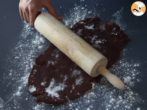 Fleurer le plan de travail (avec de la farine) puis placer la pâte à biscuit par dessus. Fleurer à nouveau et étaler la pâte à la hauteur souhaitée (1,5 cm pour nous).