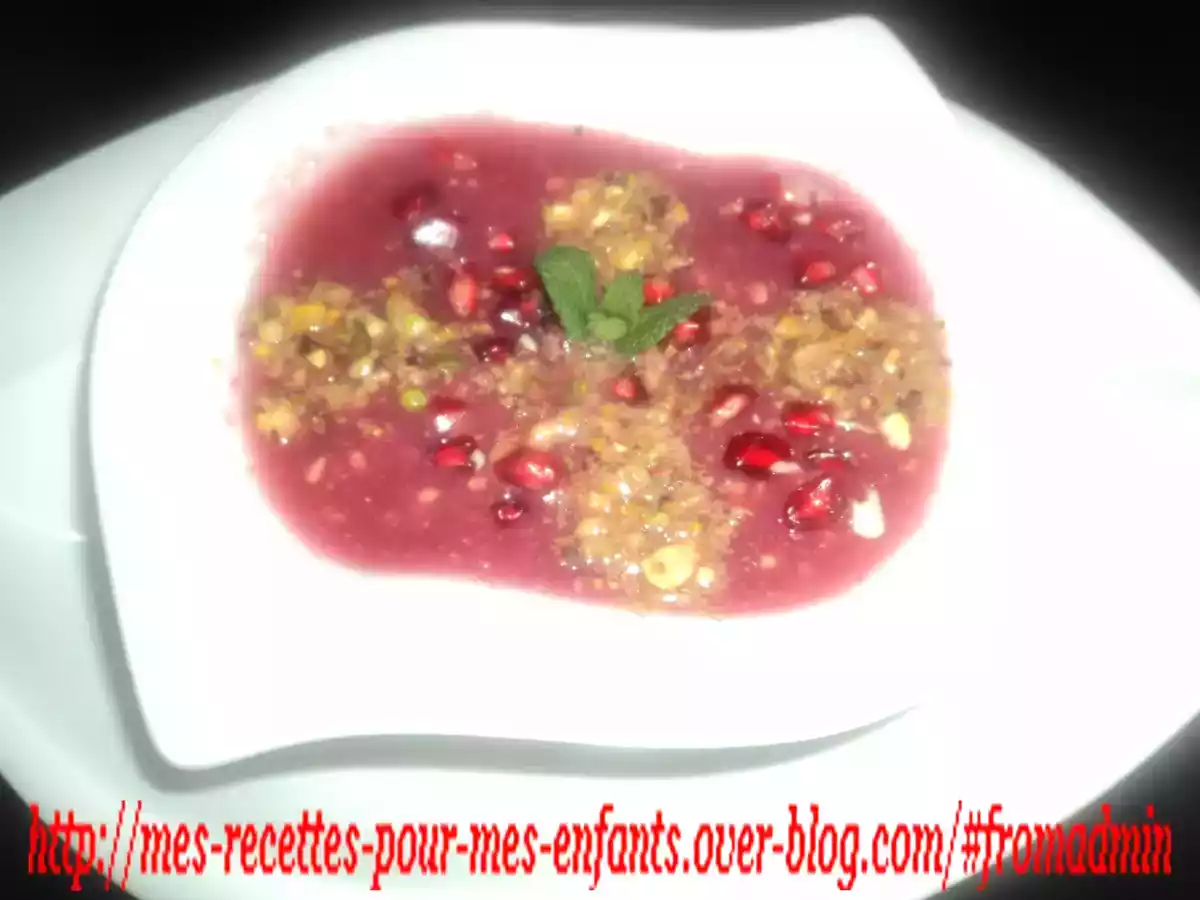 Dessert de soupe de grenade à la menthe et pistache Dessertfacile15 min269 Kcal Envoyer cette recette à un ami Imprimer cette page Poser une question à l'auteur Publier votre photo de cette recette Ingrédients 4 1 kg de graines de grenade 1 cuillères à soupe jus de citron 4 feuilles de menthe 3 cuillères à soupe de sucre 1 cc d'eau de rose 1 poignée de pistaches grossièrement hachées
