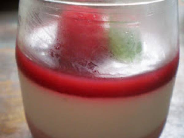 Une fois que la panna cotta a bien "pris" au frigo, ajouter délicatement un peu de coulis aux framboises sur le dessus.