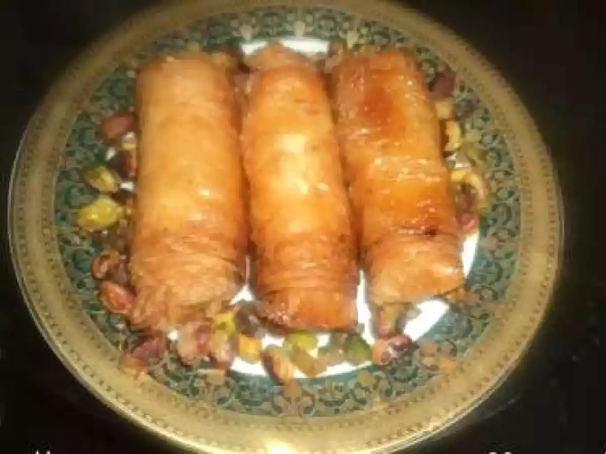 Feuille de filo farcie de pistache enrobée de sirop Dessertmoyen1 h 5 m933 Kcal Envoyer cette recette à un ami Imprimer cette page Poser une question à l'auteur Publier votre photo de cette recette Ingrédients 8 1 paquet de bricks ( ultra fines )( pour moi 1/5 paquets de filo) 250g de margarine (j'ai mis du beurre) 500g d'amandes en poudre (j'ai pas mis) 200G de pistaches en poudre (j'ai mis 500 gr concassé grossièrement) 200g de sucre glace ( j'ai mis 100 gr de sucre en poudre ) 1/2 verre d'eau de fleur d'oranger ( j'ai mis 4 cs d'eau de fleur d'oranger + 4 cs d'eau de rose) Sirop ( recette si dessus ). Coût estimé: 16.93Euros€ (2.12€/part)