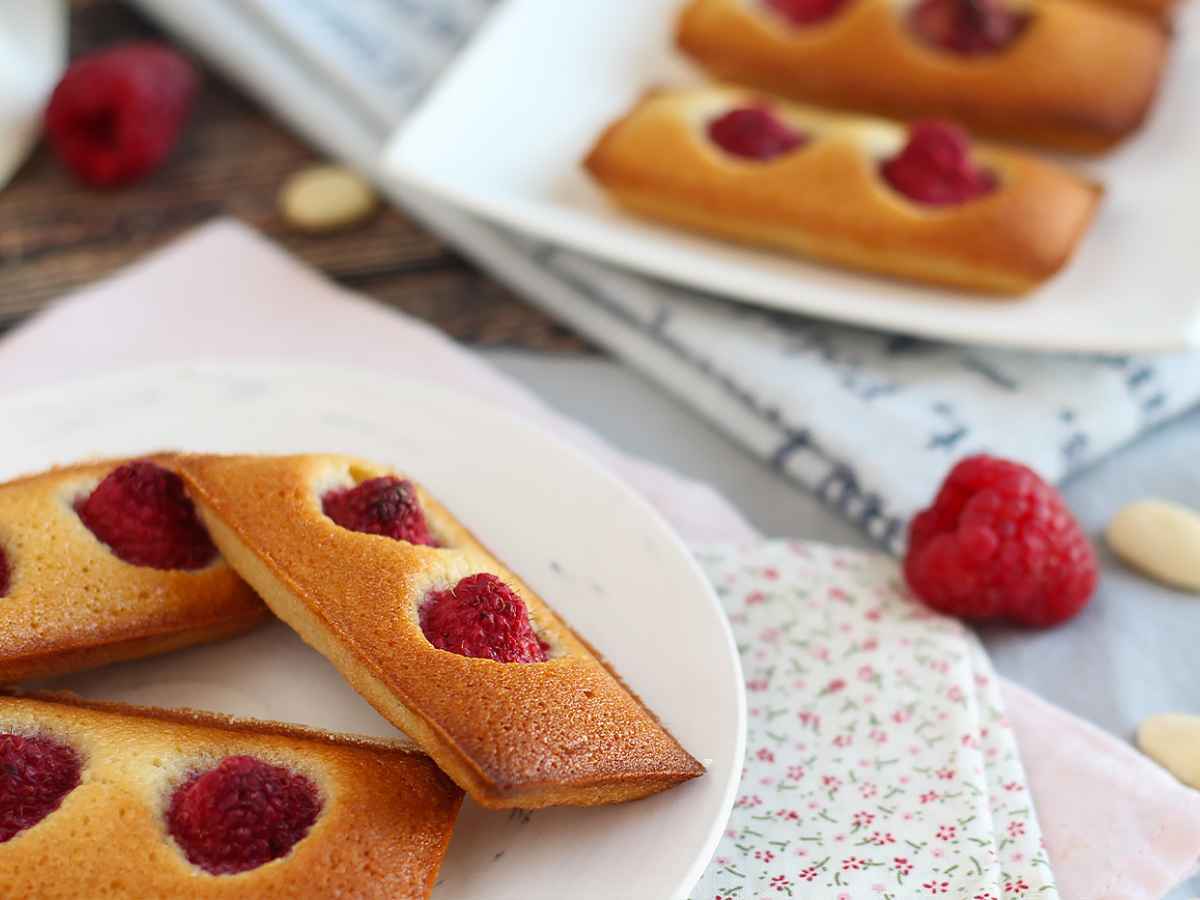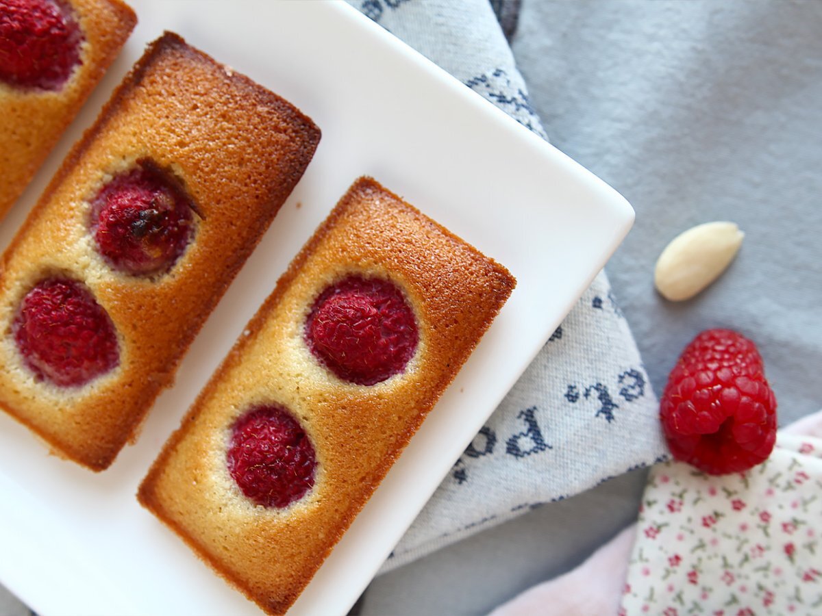Verser la pâte dans un moule à financier en silicone graissé. Planter deux framboises dans chaque financier.