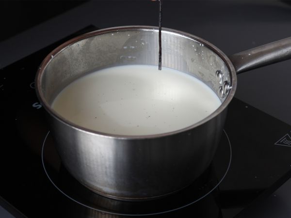 Verser le lait dans une casserole sur feu moyen. Ajouter la gousse de vanille fendue.