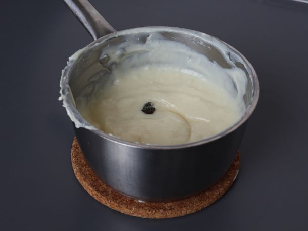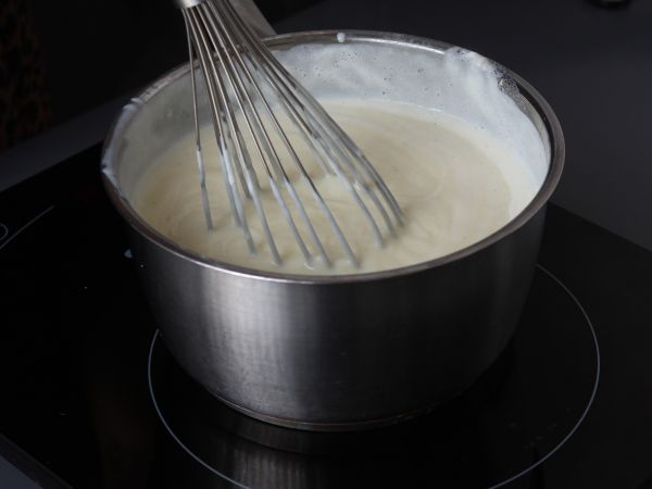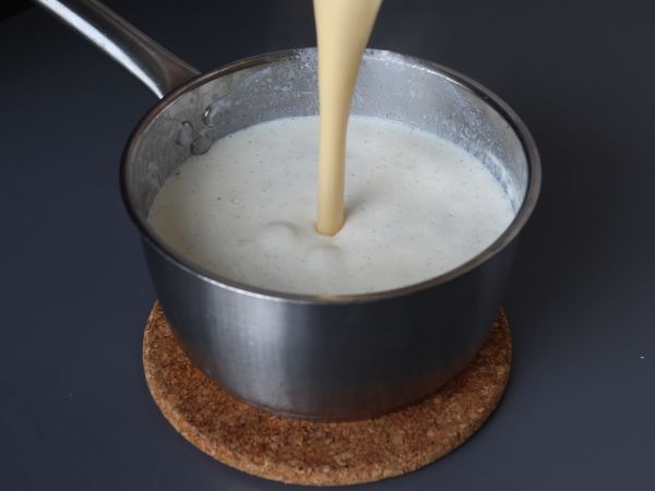 Lorsque le lait se met à bouillir, sortir la casserole du feu et réserver la gousse de vanille. Ajouter le mélange précédent et mélanger le tout.
