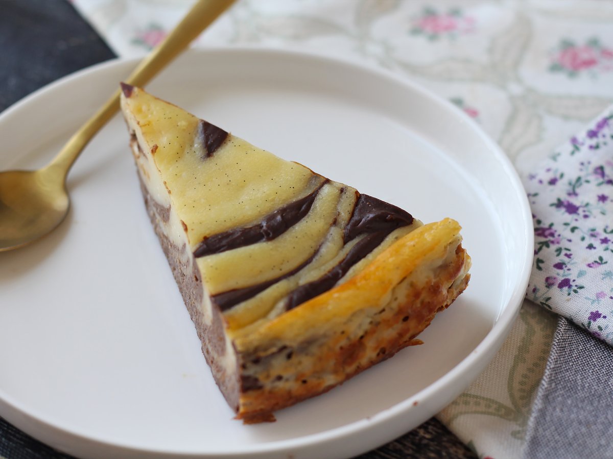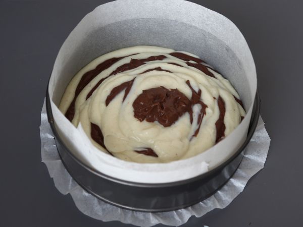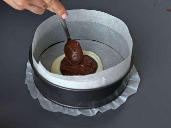 Vous pourrez comme nous ajouter des quantités égales de pâte à la vanille et de pâte au chocolat en les alternant pour créer une marbrure façon "zèbre" mais aussi ajouter des cuillères de pâtes vanille un peu partout dans le moule, recouvrir aléatoirement de pâte chocolat puis d'utiliser un pic à brochette pour mélanger grossièrement le tout et obtenir une marbrure un peu déstructurée.