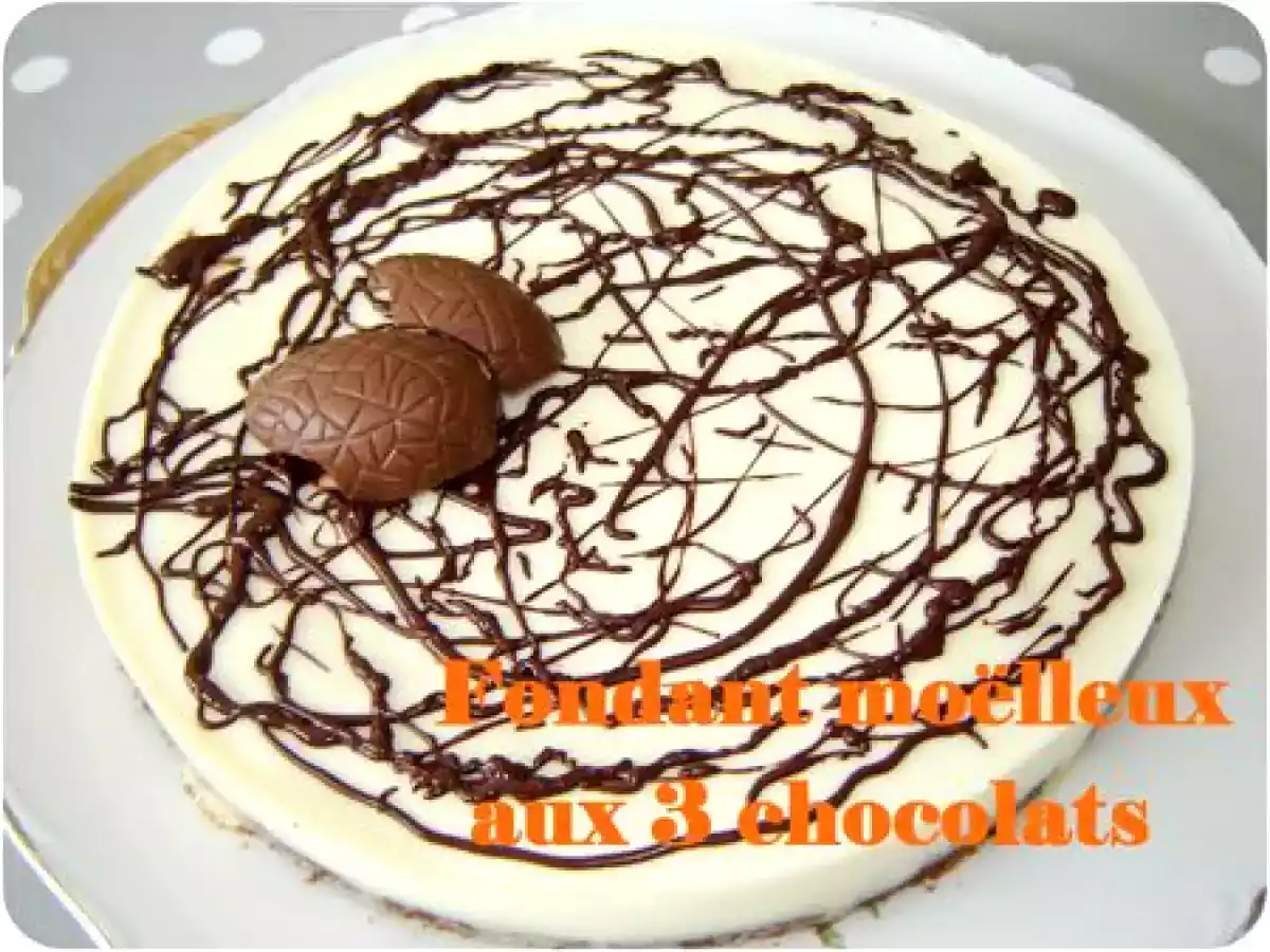 Fondant moelleux aux 3 chocolats de nestlé votez maintenant Dessertfacile30 min Envoyer cette recette à un ami Imprimer cette page Poser une question à l'auteur Publier votre photo de cette recette Ingrédients 4 100 g de chocolat blanc 170 g de chocolat au lait 150 g de fromage blanc battu à 20 % 125 g de chocolat noir 3 oeufs 60 g de farine 40 g de sucre 50 g de beurre + 20 g 2 feuilles de gélatine 1 cuillerée à soupe de sucre glace 50 ml de lait