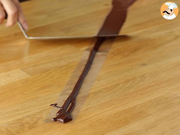 Faites fondre 60 gr de chocolat. Coupez une bande de rhodoïd à la taille exacte de la circonférence de l'entremet (62,8 cm). Faites couler du chocolat sur toute la longueur de la bande de rhodoïd, et à l'aide d'une spatule, lissez le chocolat afin qu'il recouvre bien toute la bande.