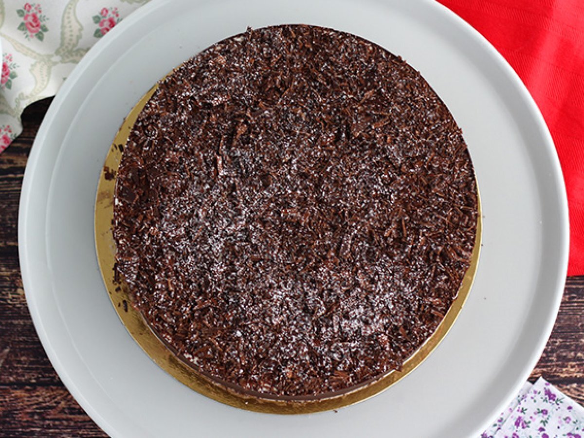 Sortez l'entremets du réfrigérateur, et ôtez la bande de rhodoïd autour. Le chocolat devrait rester collé au gâteau.