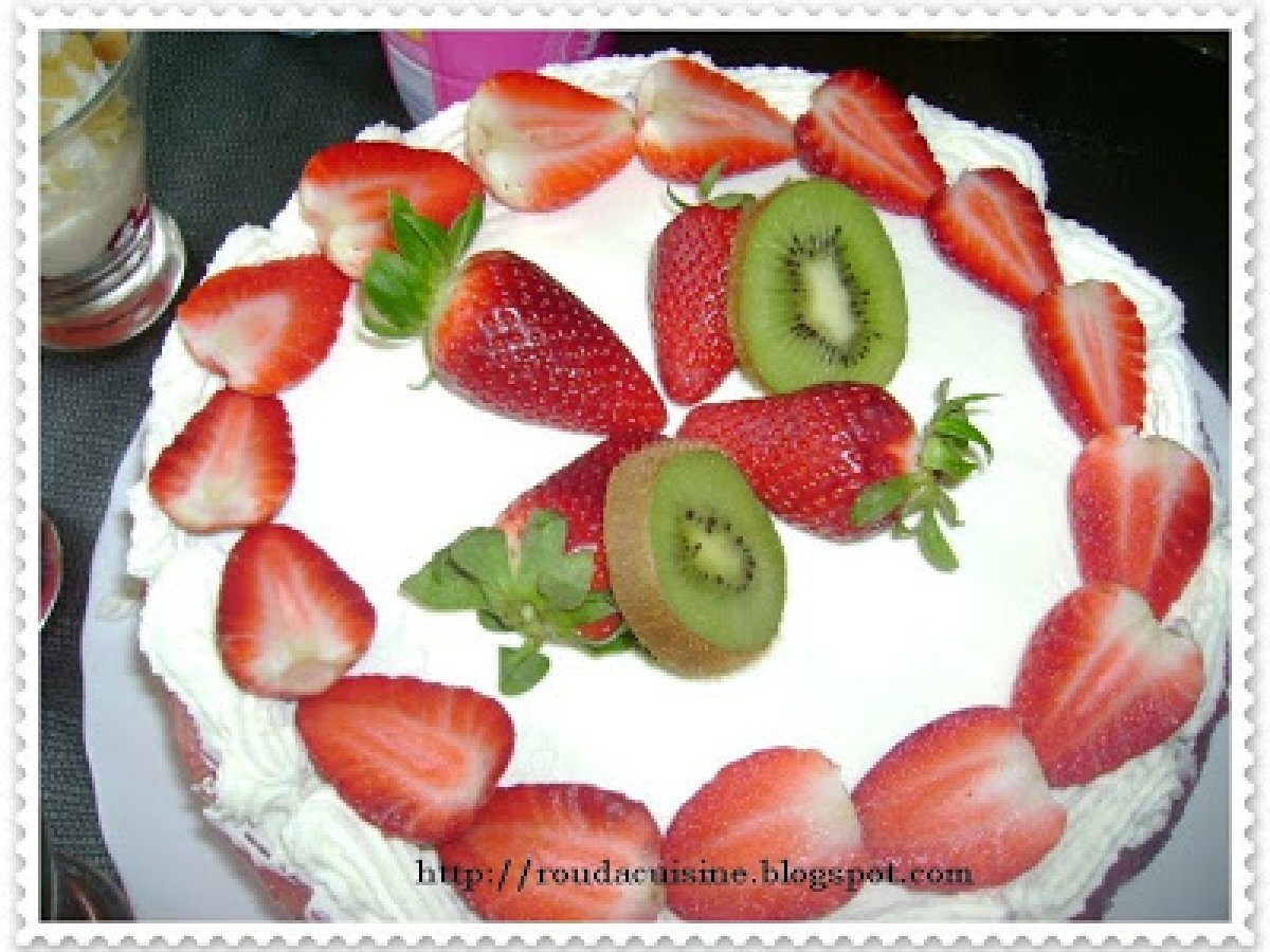 Pour finir recouvrir avec la chantilly bien ferme et bien froide et décorer selon le goût avec des fraises entières et laisser au frais.