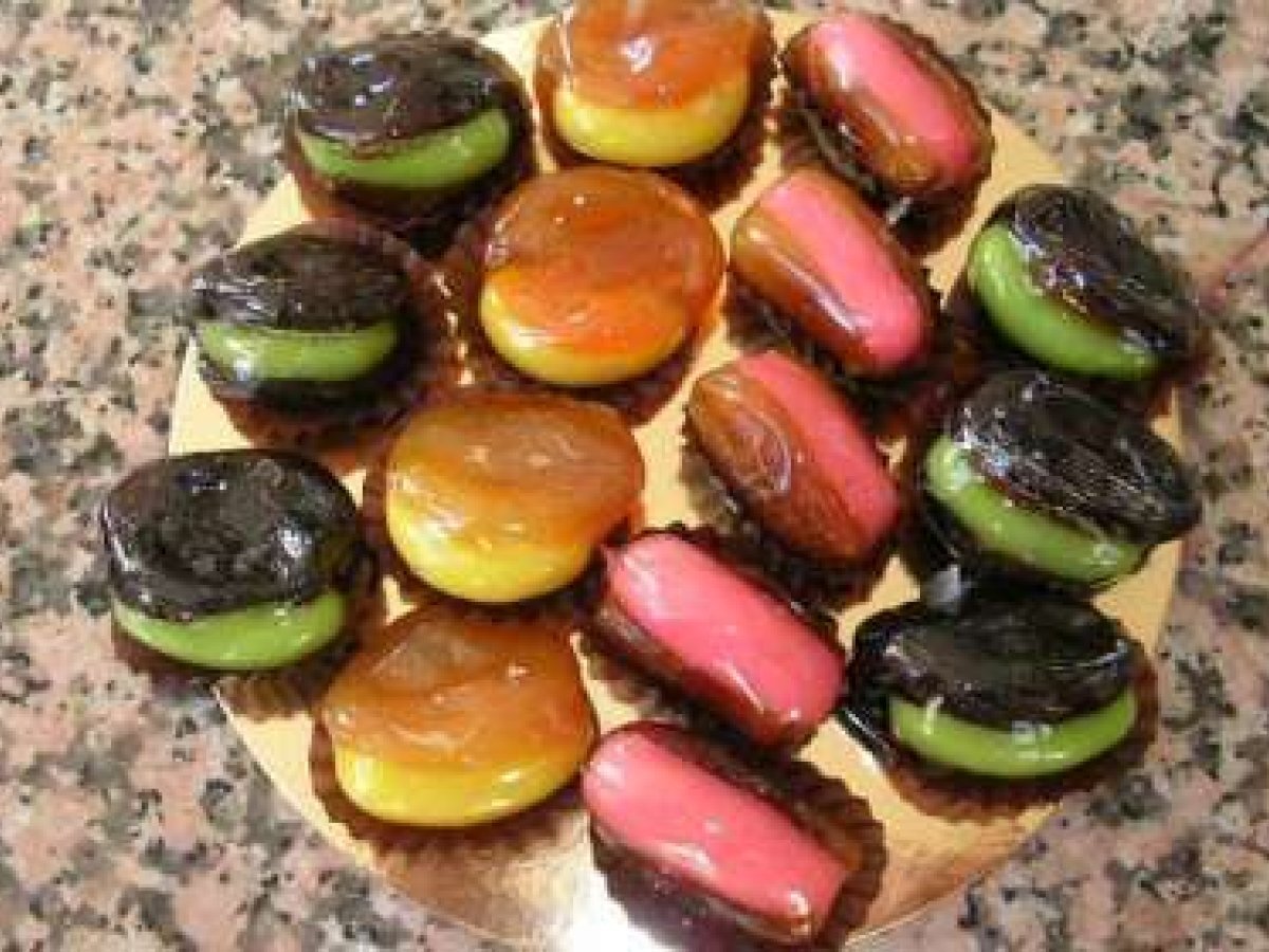 Avec la pate d'amande,faire des boudins de deux centimètres et demi.Quand on a fini,on met la pate dans le trais fait par le couteau.Ont peut aussi décorer avec des pignon de pins.Si il vous reste de la pate,vous pouver faire un carré et mettre un cerneau de noix dessus.