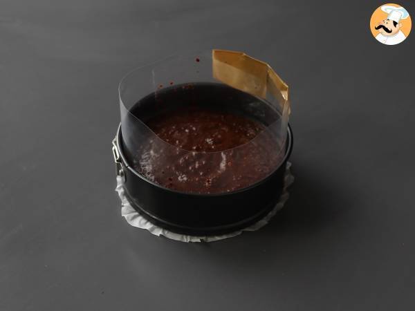 Verser le mélange dans un moule à charnière chemisé et mettre au réfrigérateur pendant 3 heures minimum.