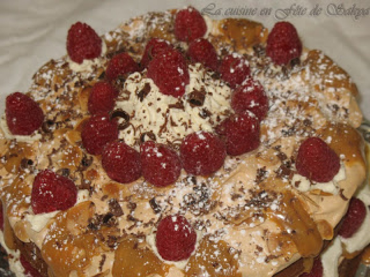 Gâteau au chocolat meringué au mascarpone, caramel à la fleur de sel et framboises