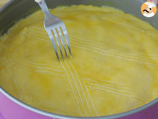 A l'aide d'une fourchette, sans trop appuyer, dessiner le motif caractéristique d'un gâteau basque. Faire 4 lignes verticales, puis tourner le moule à 45°, et faire 4 autre lignes qui formeront des losanges.