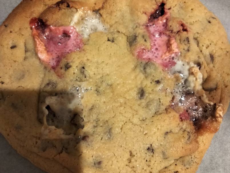 Le secret de ce cookie... La cuisson et la taille. L'idée est qu'il ne soit pas trop cuit pour garder ce côté moelleux et mi-cuit à l'intérieur, avec ses marshmallows presque coulants. Faire des cookies individuels ne fonctionnerait pas, un marshmallow seul aurait tendance à fondre et à se mélanger à la pâte.