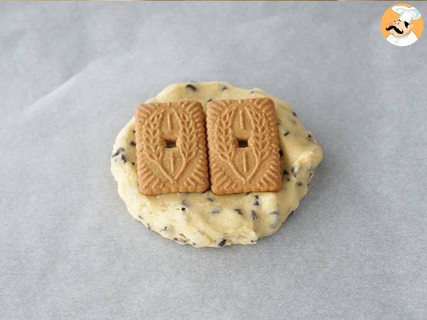 Alternatives : on varie les plaisir lors de la garniture du cœur du cookie. Nous avons opté pour deux biscuits aux spéculoos et des marshmallows, mais selon les goûts, on pourrait très bien imaginer remplacer les biscuits par des carrés de chocolat pour un résultat 100% gourmand ou des Oréo par exemple. On peut aussi imaginer utiliser un ingrédient crémeux comme une pâte à tartiner ou du caramel.