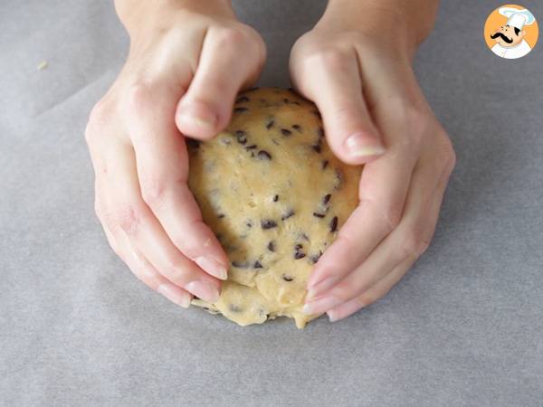 Prendre l'autre moitié de la pâte à cookie et recouvrir le tout, en scellant bien les bords. Ne pas aplatir le cookie, laisser en boule afin qu'il soit à la fois croustillant et moelleux.
